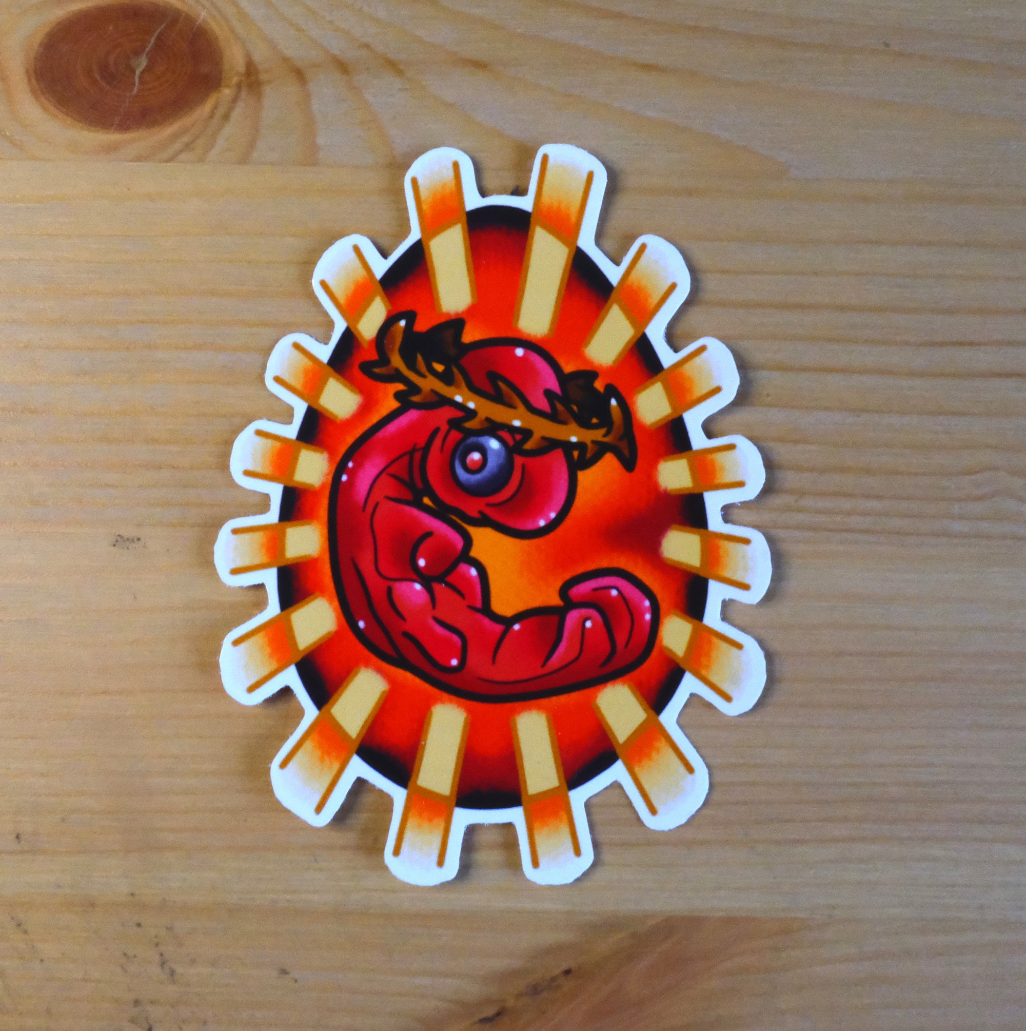 7cm wide glossy vinyl sticker, made in house (literally, I make them at home!)